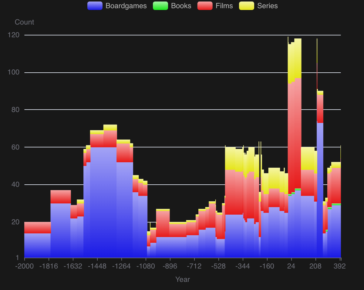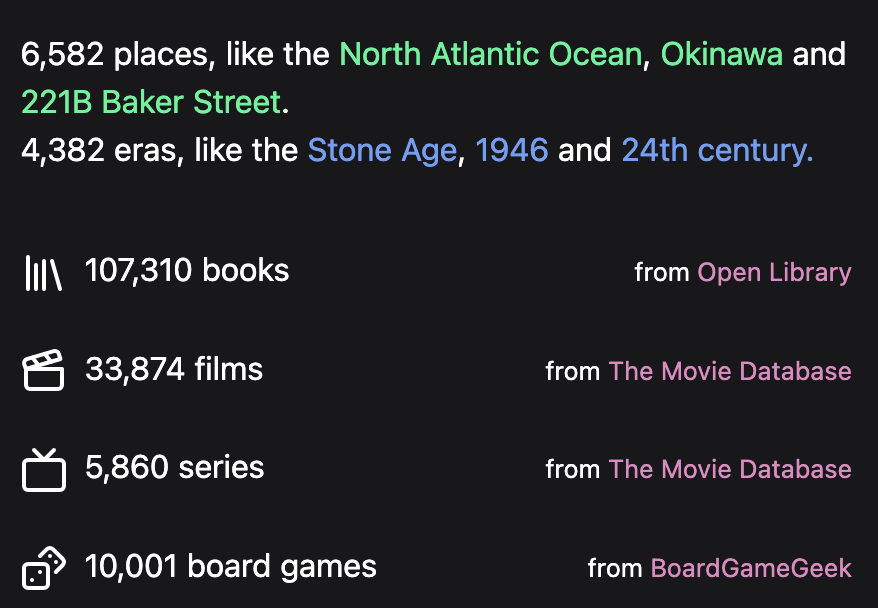 It is supplemented with time periods found in OpenLibrary. It’s pretty easy to use any “subject:time” tag that contains year-like numbers, such as Bombardment, 1943-1944. In this way, if an OpenLibrary user tags a book with a named era, it will then match films, series and board games in those respective databases.