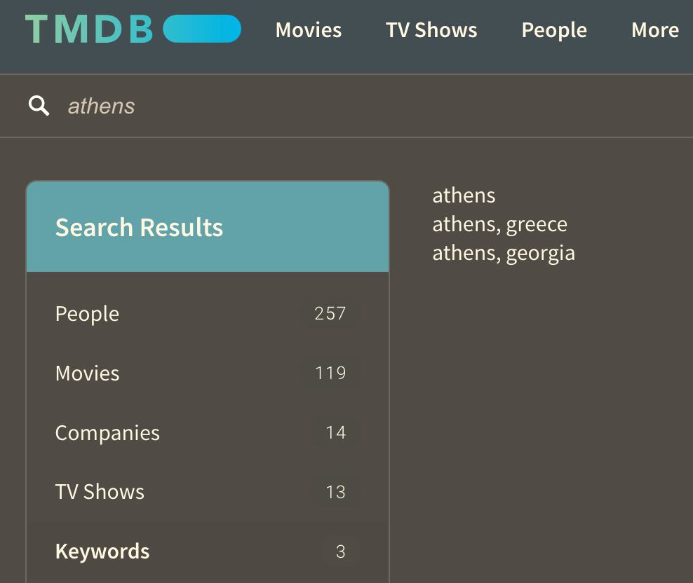 -sourced alternative to IMDB, and has been around a long time. It has a great API with no real usage restrictions, but no data dumps. It has a less specific system of keywords, where “georgia” can mean the US state, “georgia europe” the country, and “georgian” the reign of King George.