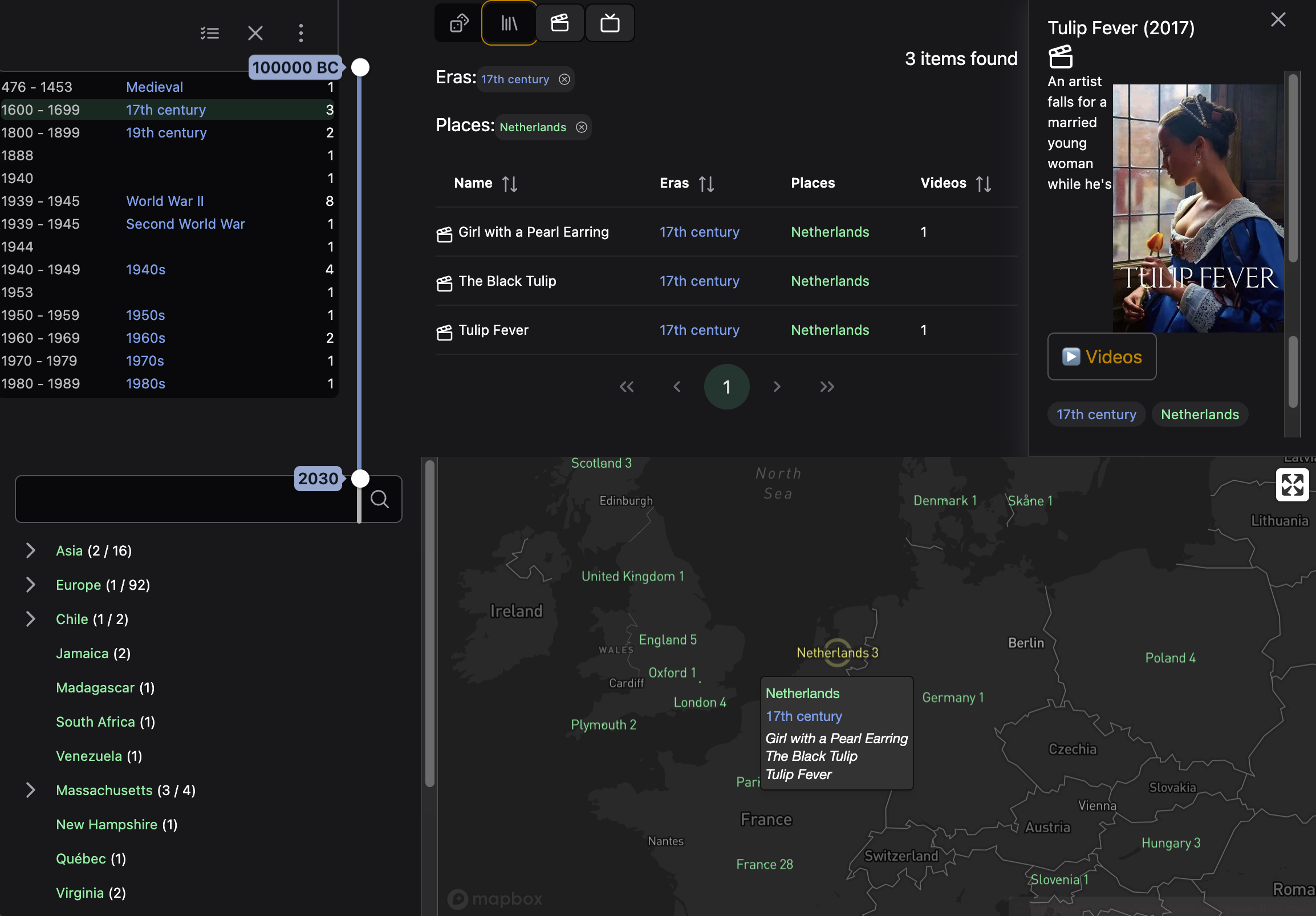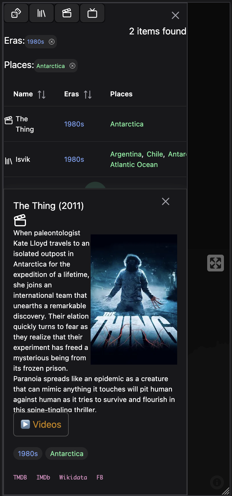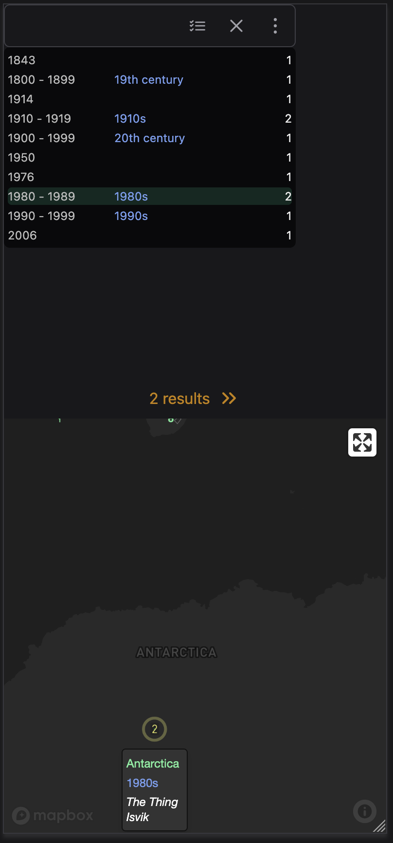 Whenever is my latest passion project: it’s a mappy web database of films, series, books and board games organised around when and where they are set: Paris in the 19th century, Canada in the 1970s, China in the Han Dynasty. You can play with it at whenever.world. It currently has:
