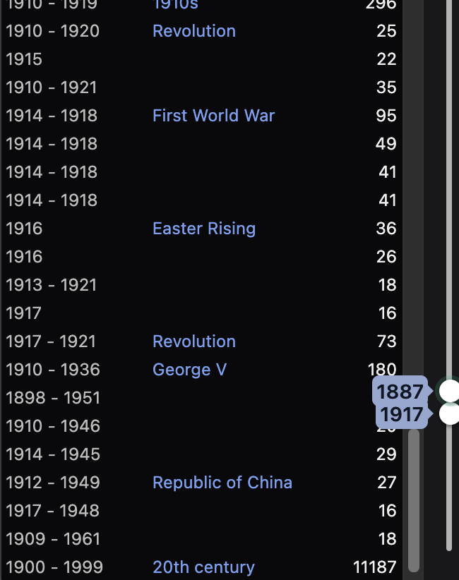There’s a lot more work to do. One interesting question is how to manage eras that are geographically bounded: “US Civil War” is a period of time, but it also tells you the thing happened in the US. “Tang Dynasty” probably means the thing was set in China, as well as being from 623 to 907 AD.