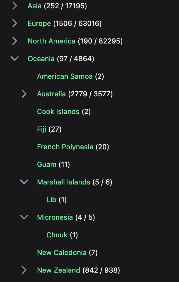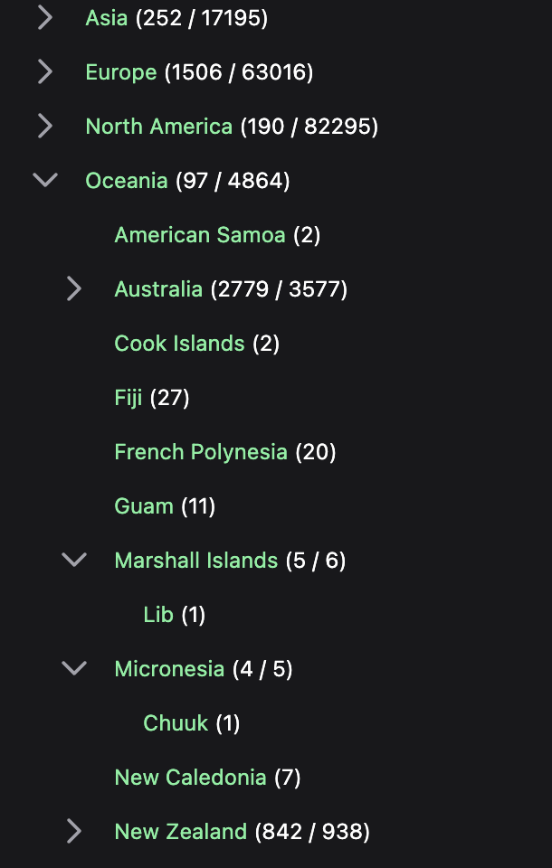 From these sources my scripts load countries, cities, admin1 boundaries (eg, California, England) and in some cases admin2 boundaries (eg, Oxfordshire). To these I have some hand-made datasets of continents, seas (eg Adriatic, Tasman, North Atlantic), landmarks (221B Baker St, Alcatraz), mountains (Denali, the Himalayas), regions I call “blocs” for want of a better word (eg Northern Europe, Southeast Asia).