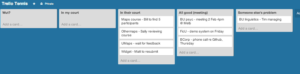 • Wut?: the most dangerous column, projects where I’m not sure what the current state is after all. Am I waiting on them? Did I promise to research something and get back to them?